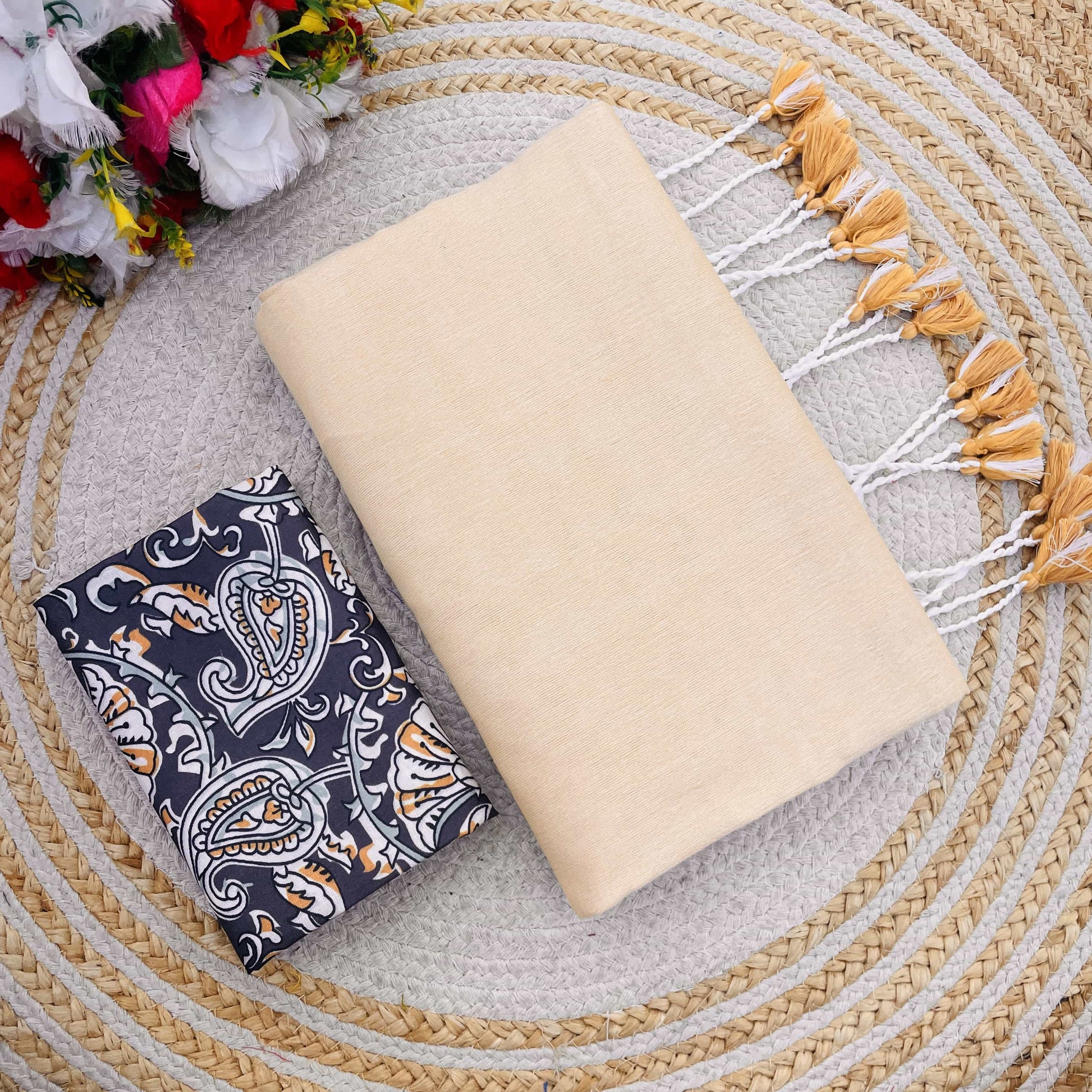 Plain Khadi Cotton Saree with Digital Print Blouse – Elegant & Comfortable Wear